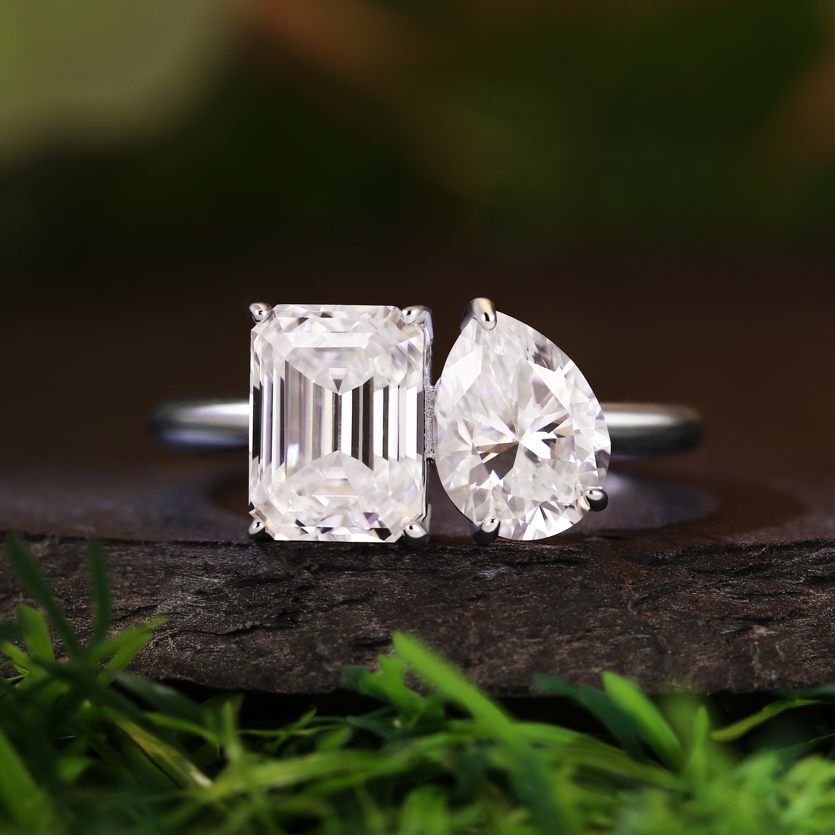 2. Main Stone: 6x8mm Emerald Cut Moissanite and 6x8mm Pear Cut Moissanite