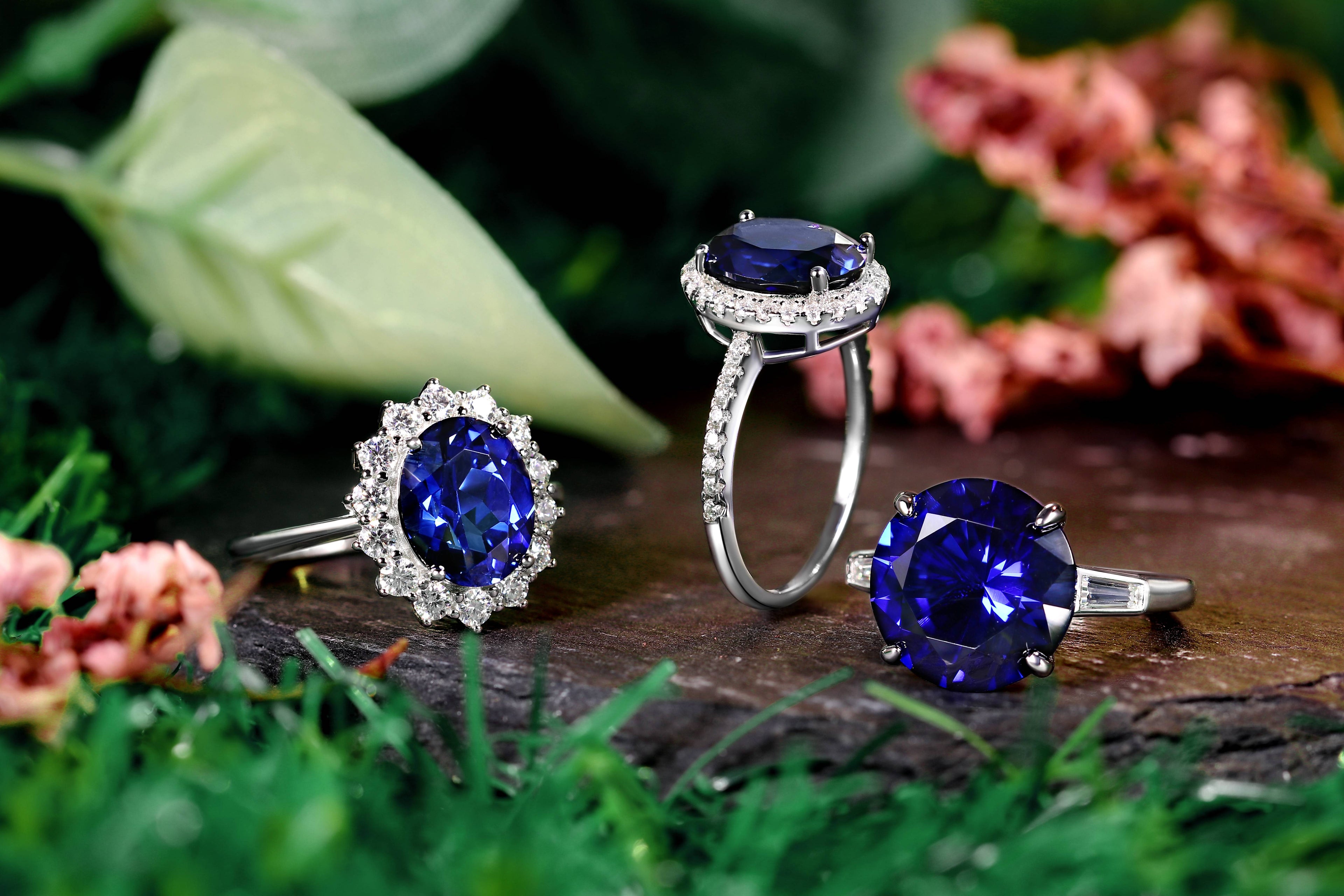 Anillo de compromiso de tres piedras con zafiro azul de laboratorio redondo de 6 ct