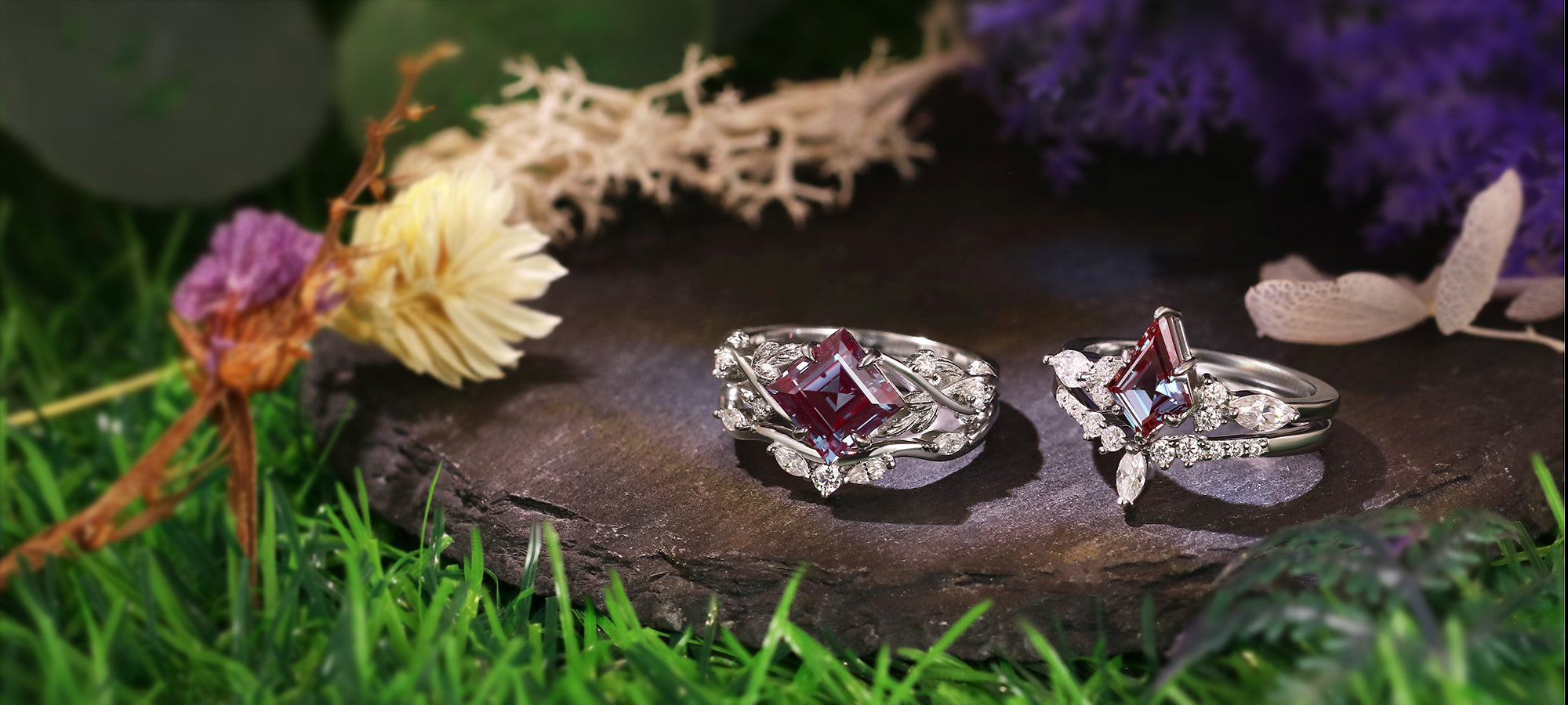 1.85ct Pear Cut Lab Alexandrite Twig Leaf Engagement Bridal Ring Set