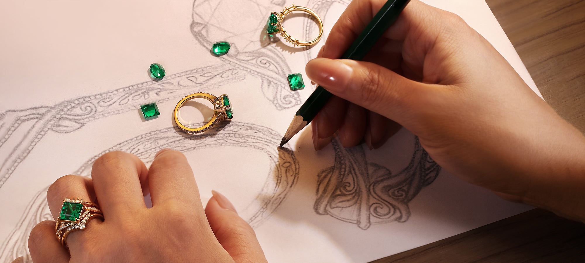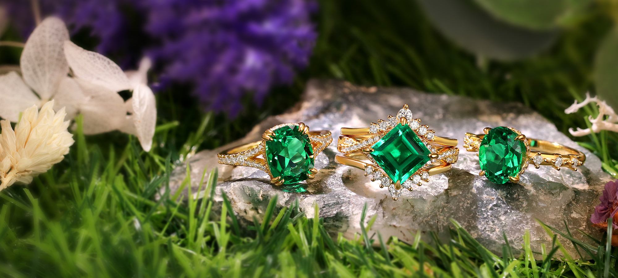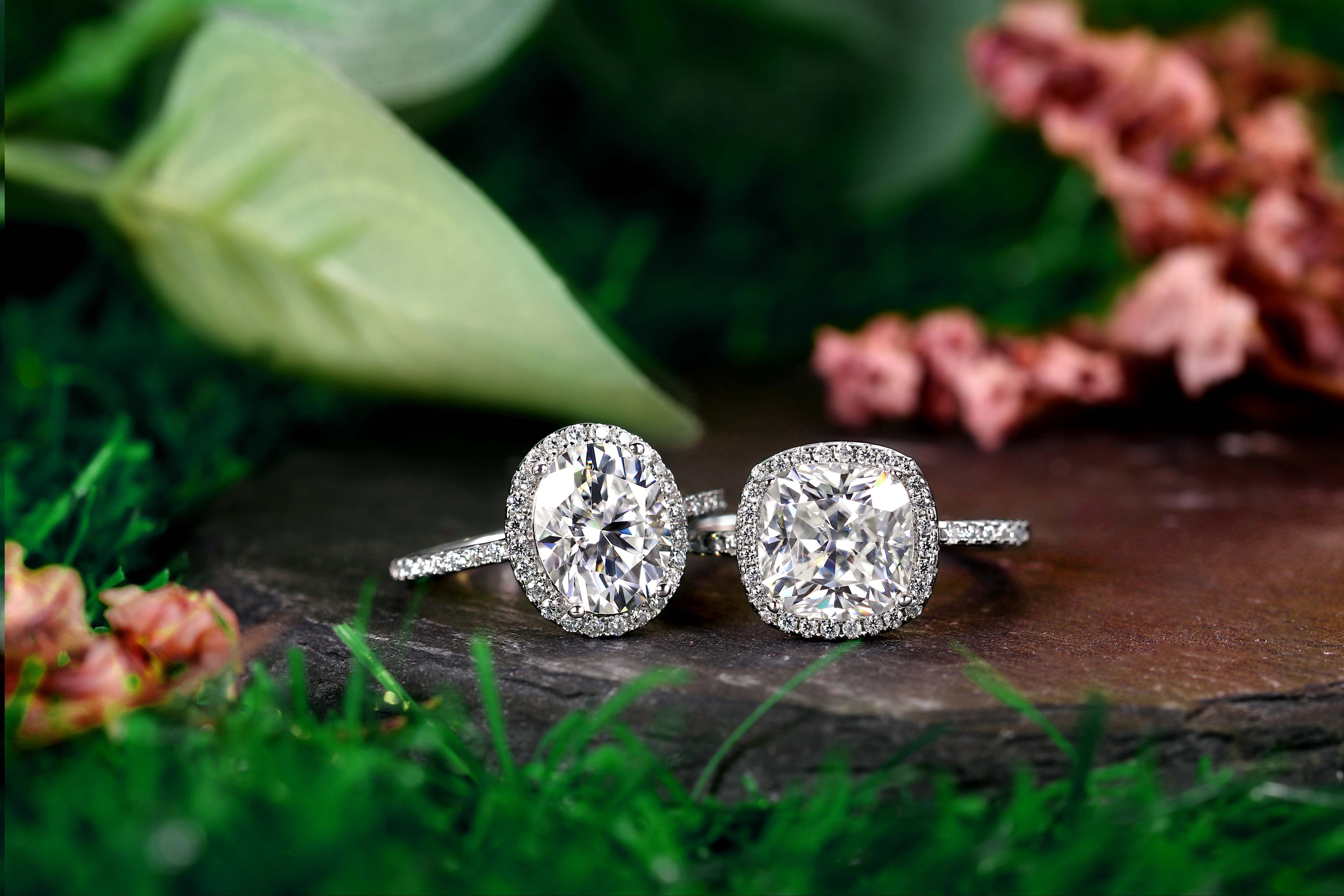 Anillo de compromiso con halo de esmeraldas de laboratorio ovaladas de 1 ct