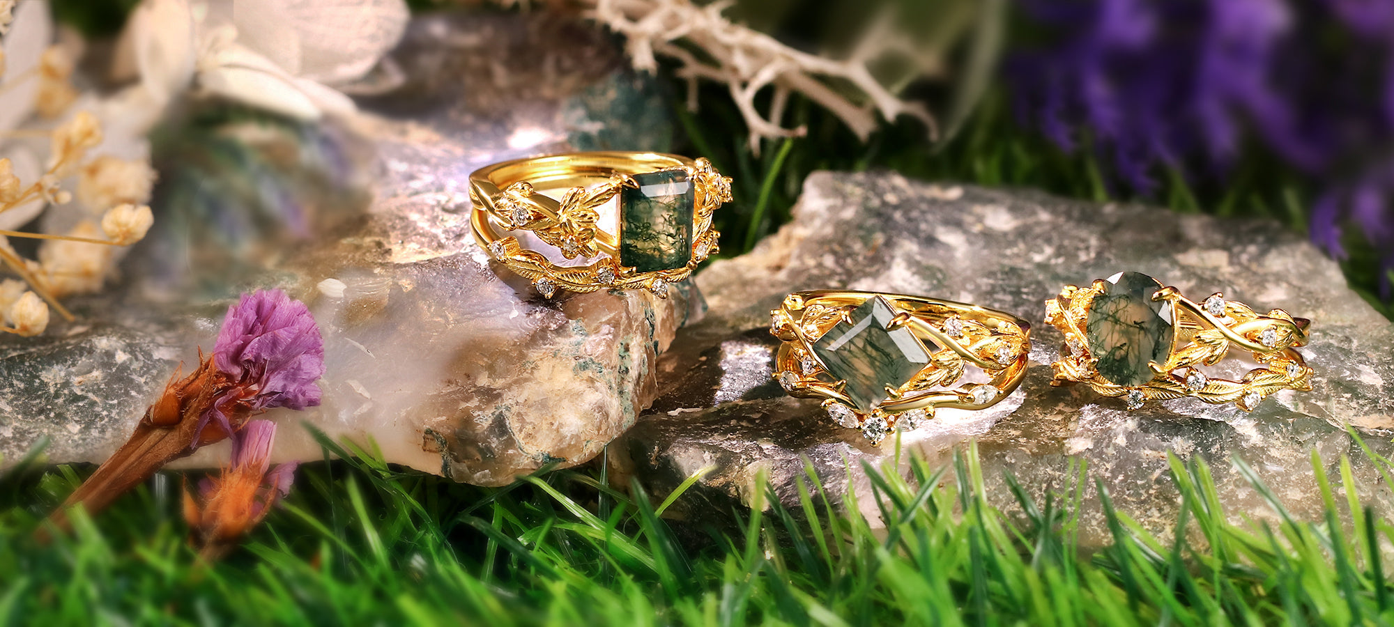 Vintage 5*10 Marquise Cut Moss Agate Retro Claw 6 Prong Bridal ring Set