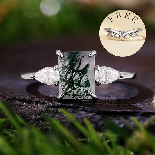 [Buy 1 Get 1 Free]6x8 Emerald Cut Moss Agate Three Stone Ring Unique Bridal Ring Set