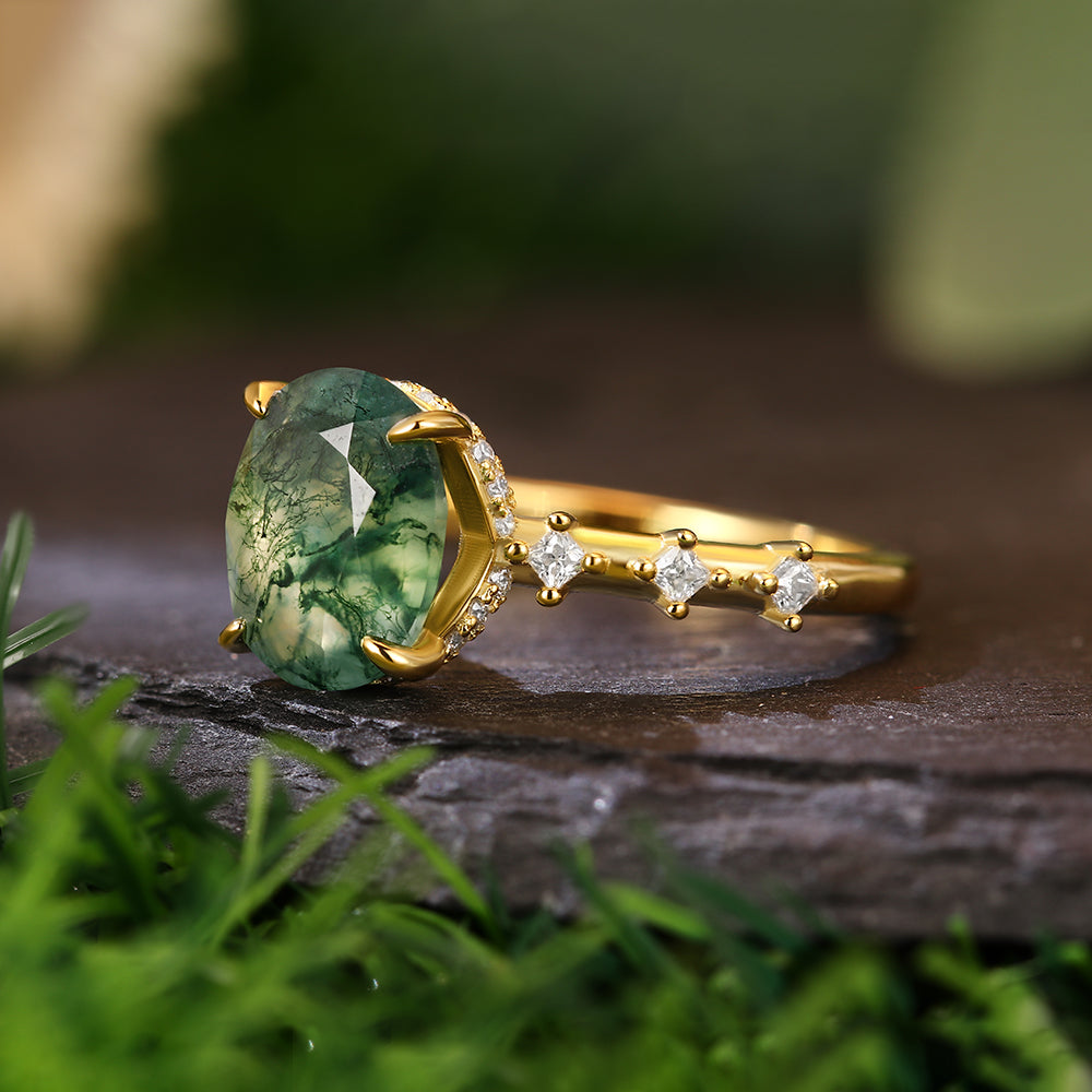 8x10mm Oval Cut Moss Agate Hidden Halo with Princess Cut Moissanite Accents Nature-Inspired Engagement Ring