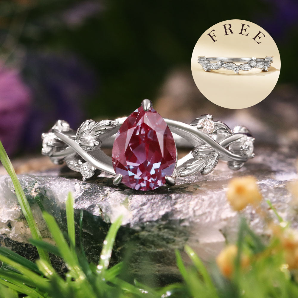 [Buy 1 Get 1 Free]1.71ct Pear Cut Lab Alexandrite Nature Inspired Twig Leaf Engagement Bridal Ring Set