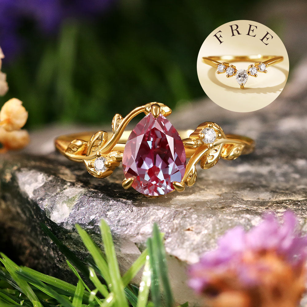 [Buy 1 Get 1 Free]1.85ct Pear Cut Lab Alexandrite Twig Leaf Engagement Bridal Ring Set
