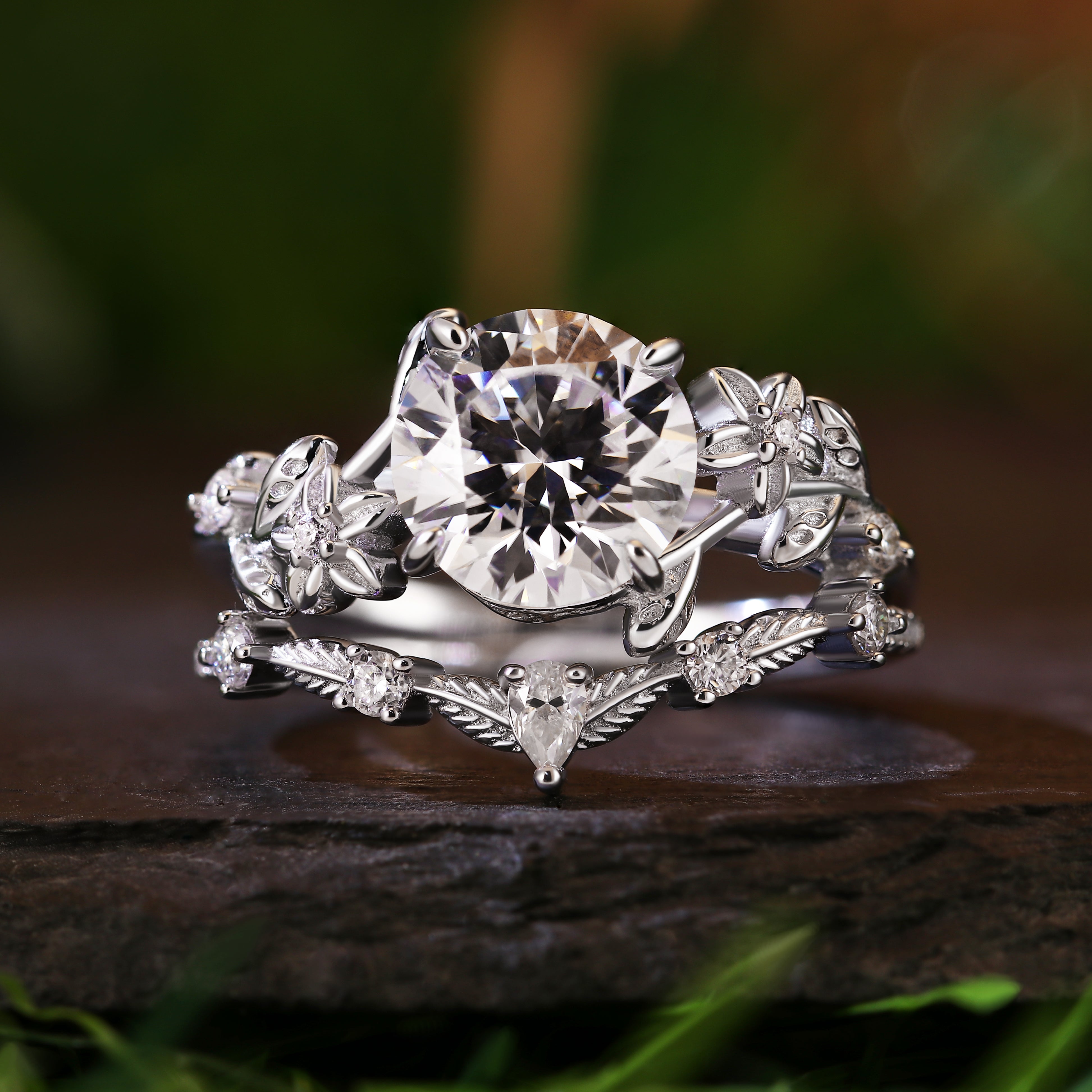 2.21Ct Round Cut Moissanite Flower Engagement Ring Curved Wedding Band Nature Vines Bridal Set