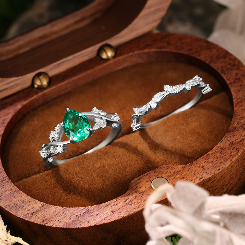 1.16ct Pear Cut Lab Emerald Nature Inspired Twig Leaf Bridal Ring Set