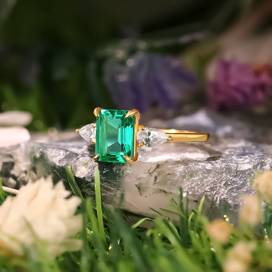 1.87ct Emerald Cut Lab Emerald Three Stone Ring Unique Bridal Ring Set